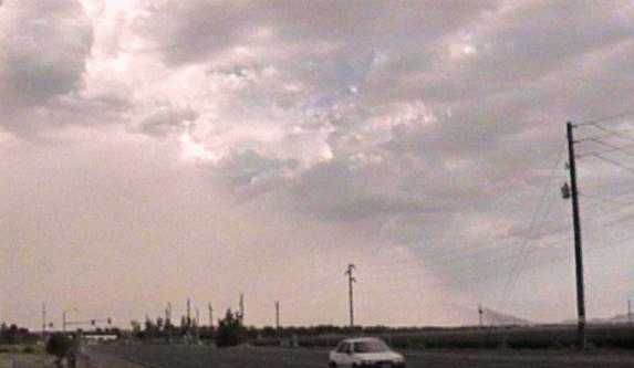 Haboob: - A lens-shaped dust wall generated from surface outflow (see downbust) from a mature thunderstorm cell. The name comes from the Arabic word habb, meaning "wind." Haboobs are most frequent in SW North America during the month os May through September, with most frequent occurrence in June, but they can occur in every month. Their average duration is less than three hours. The average maximum wind velocity is over 30 mph and dust may raise to heights exceeding 3000 feet. This nice image of a haboob on 30 July 1995 was captured by AZTC member John Moore during one of our missions: