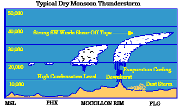 Dry downbursts will not necessarily show a solid perturbation from the base of the cloud to the characteristic curl. Instead, a dry downburst is generally only visible when the vertically descending winds hit the ground and pick up substantial quantities of dust. These types of downbursts are common in Arizona and will be particularly evident during the early portion of the monsoon season when there is still little precipitation associated with thunderstorms.